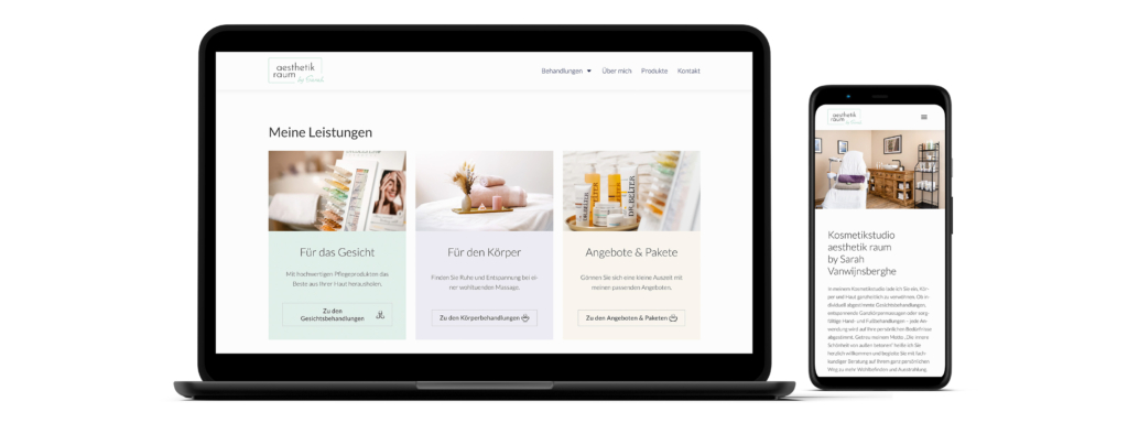 Für umfassende Sichtbarkeit sollte sich der „aesthetik raum“ auch online von seiner besten Seite zeigen. Das Team entwickelte eine visuell ansprechende und intuitive Website, die auf allen Bildschirmgrößen responsiv funktioniert. Mit ihrem modernen Look und der Optimierung für Suchmaschinen kann sich das Endresultat sehen lassen:  www.aesthetik-raum.de